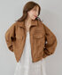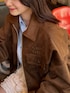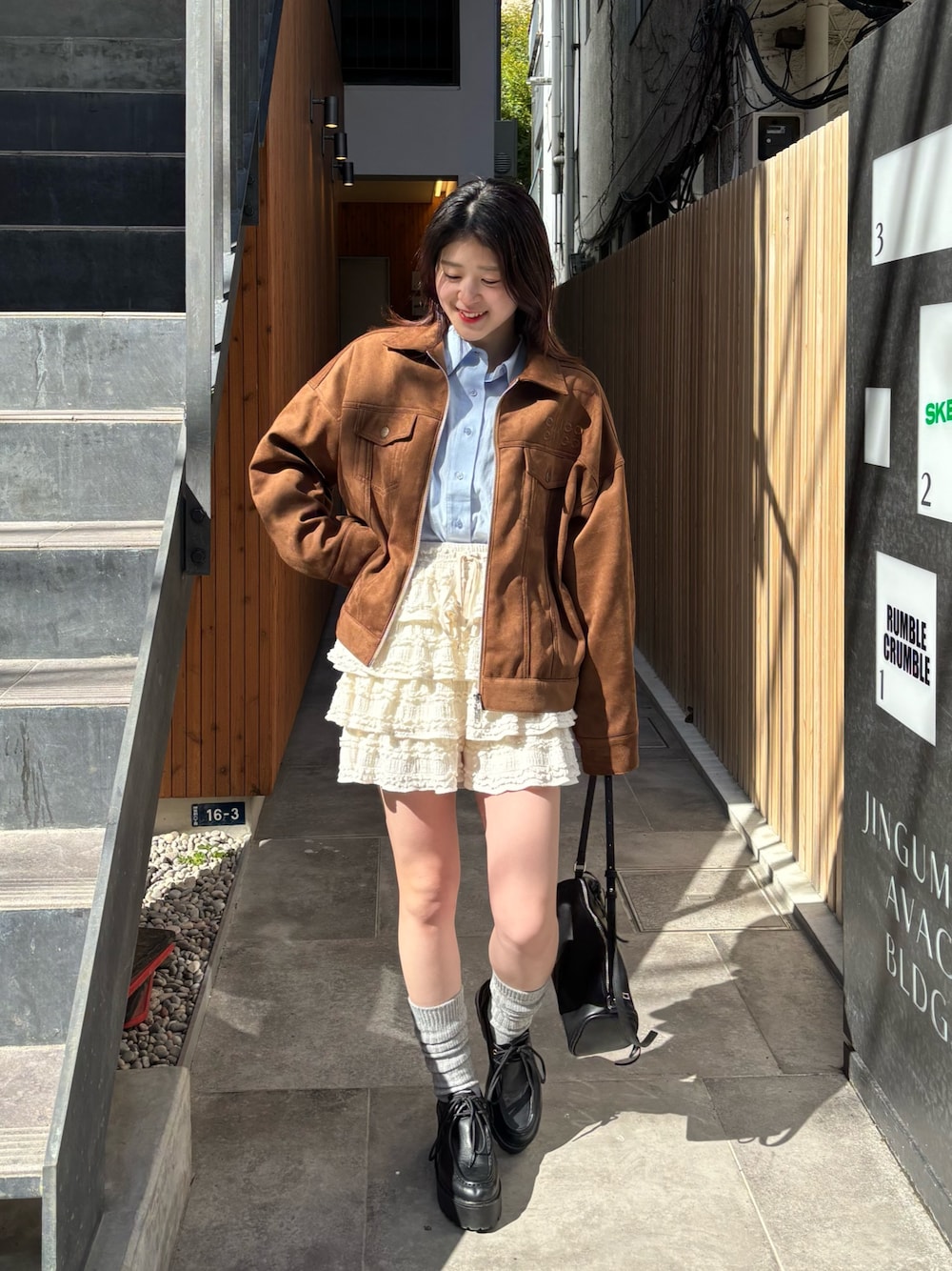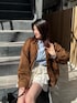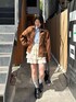 ブラウンのスエード素材のアウターに ブルーシャツを入れるのが今年よく見かけるスタイリング!! 157cmでアウターの丈が長すぎず短すぎで着れるからミニ合わせでもロングボトム合わせでもどっちもバランスが取りやすかったです!