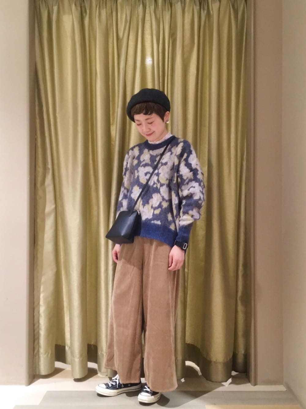 大きめの花柄ニットに レースのハイネックインナーを合わせ ガーリーカジュアルに。 コーデュロイのワイドパンツで ゆるいシルエットにしました◎ ブルーとベージュのカラーで ほんのり秋コーデです!