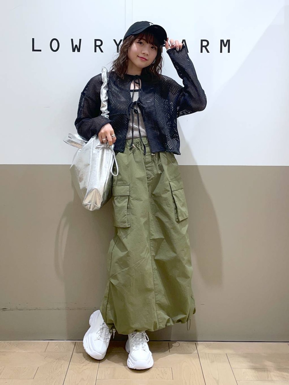 春のミリタリーコーデ✨ ⭐各アイテムのおすすめポイント  ̄ ̄ ̄ ̄ ̄ ̄ ̄ ̄ ̄ ̄ ̄ ̄ ̄ ̄ ̄ ̄ ̄ 【トップス】 リボンが可愛いメッシュのカーディガンアイテム! 今年はメッシュにパッチワークが施されていて、さらにおしゃれに✨ インナーを変えるだけで今から夏場まで着ていただけます。 ショート丈なのでハイウエストのボトムスと相性が良いです◯ 【ボトムス】 ドロストカーゴのスカート。 シャカシャカとした生地で着るだけで立体感が出ます。 前回のものよりも柔らかい生地なので動きやすいです♡