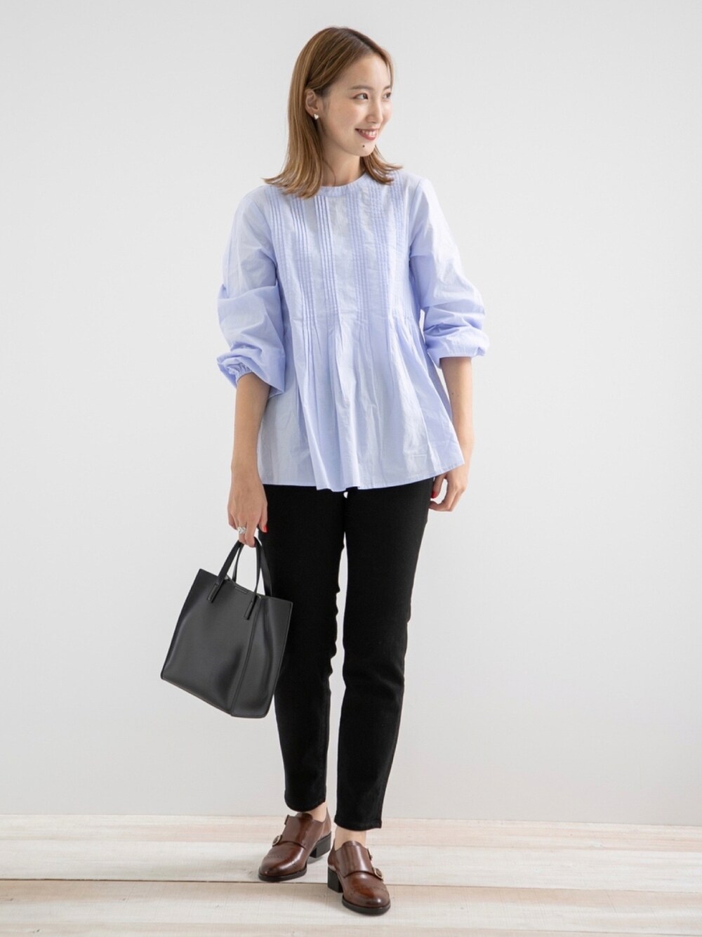 胸元にはいったタックで顔まわりも華やかなブラウス* フレアシルエットでちょうど腰にかかるので、腰ハリをうまくカバーしてくれます◎ 細身のパンツを合わせるとさらにスッキリ見えします^^ 新作のスキニーデニムはストレッチが効いた素材でフィットしながらもとても動きやすいです! スタイリングに重宝するアイテムなので、是非チェックしてみてください♪