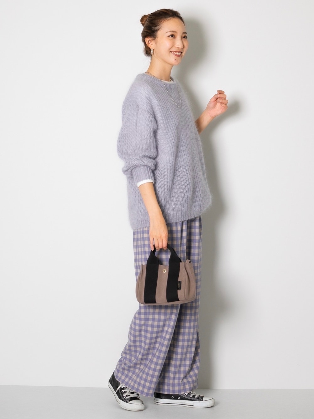 今季おすすめのカラーニット* モヘヤ混ならではの毛足が長めでふわっとした表面感がシーズンムードを高めてくれます^^ やや透け感があるのでロンTを重ねています! ボトムはカラーを合わせてWEB限定のギンガムチェックのパンツを合わせました! ワントーンコーデは柄ものをミックスするとメリハリが出るのでおすすめです!