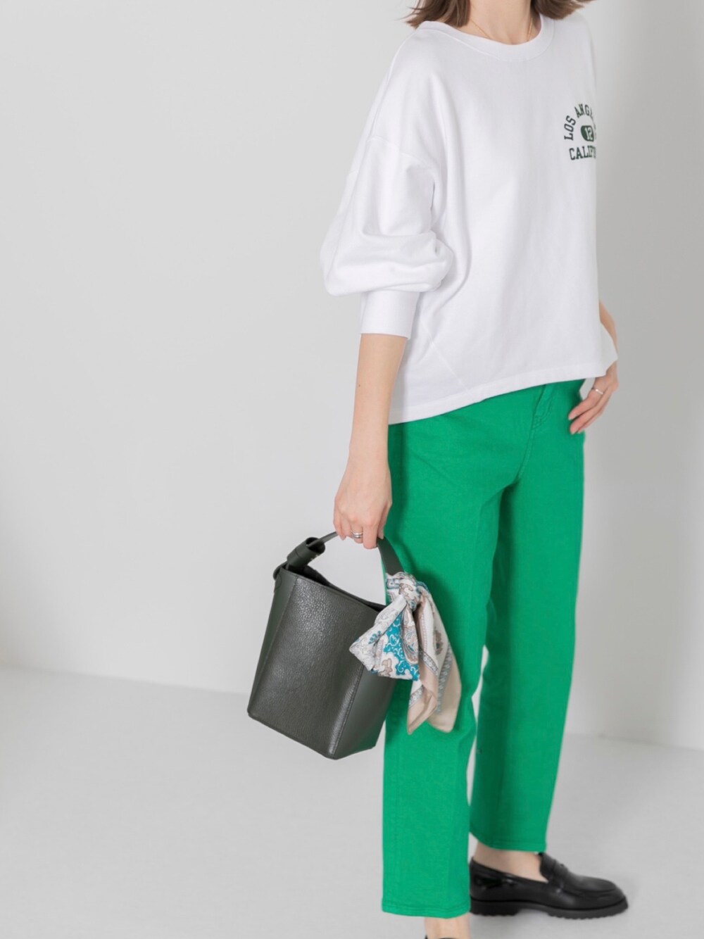 トレンドカラーのグリーンをポイントにしたカラーコーデ* スウェットは後ろの丈が長めのデザインで、 一枚で着てもこなれた雰囲気が出ます◎ ゆったりした袖も今年らしくて女性らしくお召しいただけるスウェットになっています。 ボトムはスウェットのロゴに合わせてグリーンのパンツを合わせました! ストレッチの効いた柔らかいデニム地で、センタープレスが入ることでラフすぎない印象です◎ 足首が見える短めの丈で、ボリュームのある靴ともバランス良く着用できます! Instagram→→@okome_album