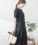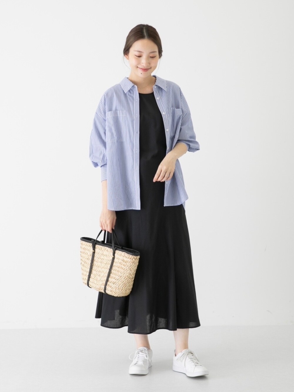シンプルなブラックワンピにストライプシャツをプラス。 着るだけでサマになるおすすめシャツです!