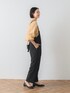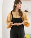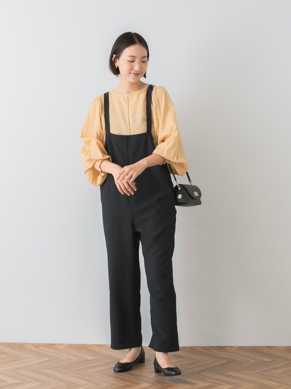 ブラウス×サロペットのスタイリング* カジュアルになりがちなサロペットですが、今回は着用したサロペットは、 さらっと落ち感のある素材で大人が着やすい雰囲気になっています! バック部分のリボンがポイントで、肩紐の長さもここで調整できます◎ フラットな表面なので、インナーはジャガード織りが特徴的なブラウスを合わせました! インド生産ならではの程よくカジュアルな雰囲気でボリューム袖もドレッシーになりすぎません♩ フロントや袖付け部分のはしごレース使いもポイントで、1枚で着てもかわいいです(^^)
