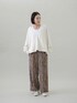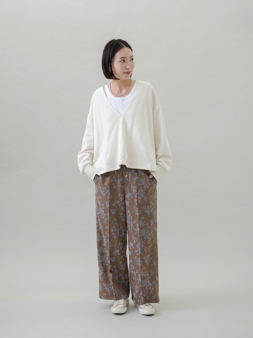 深Vネックのスウェットと柄ボトムで秋らしいスタイリングにしてみました* スウェットが1枚で着られる季節。 深Vであることで、シンプルなスウェットより女性らしくこなせるトップスです◎ 今の時期はタンクトップやTシャツと重ねて。 もう少し気温が下がったら、タートルネックのインナーなど重ねて着たいです(^^) パンツは起毛のかかったフラワープリントがかわいい柄パンツ。 シンプルになりがちな秋冬のスタイリングのアクセントに1枚あると重宝します! ウエストはゴム仕様で履き心地も抜群です◎