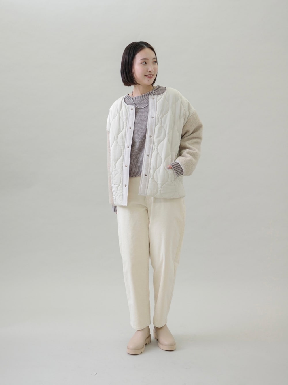 1つ前のコーデにアウターを羽織りました* 袖がボアに切り替わっているキルティングブルゾン。 何より軽くてストレスフリーな着心地です◎ ボタンあきなので抱っこ紐ママにもおすすめのアウターです(^^) ショート丈で、車や電車で座るときにも気にならないので、 もう少し気温が下がったらつい手に取ってしまうアウターになりそうです!