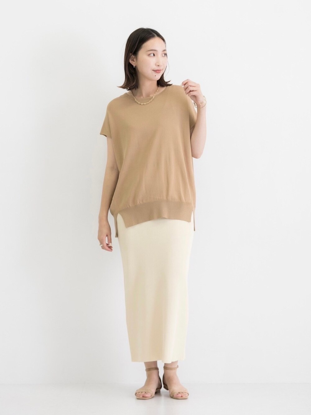 フレンチスリーブのトップスとリブスカートがセットになったお得なアイテム♡ UVカット機能付きのサマーニットで、 コーデいらずで洒落見えするのがポイントです! マシンウォッシュOKなので、ニットでもデイリーにお召しいただけます◎ セットでも別々でも、お手持ちのアイテムと合わせてスタイリングの幅が広がるアイテムです!