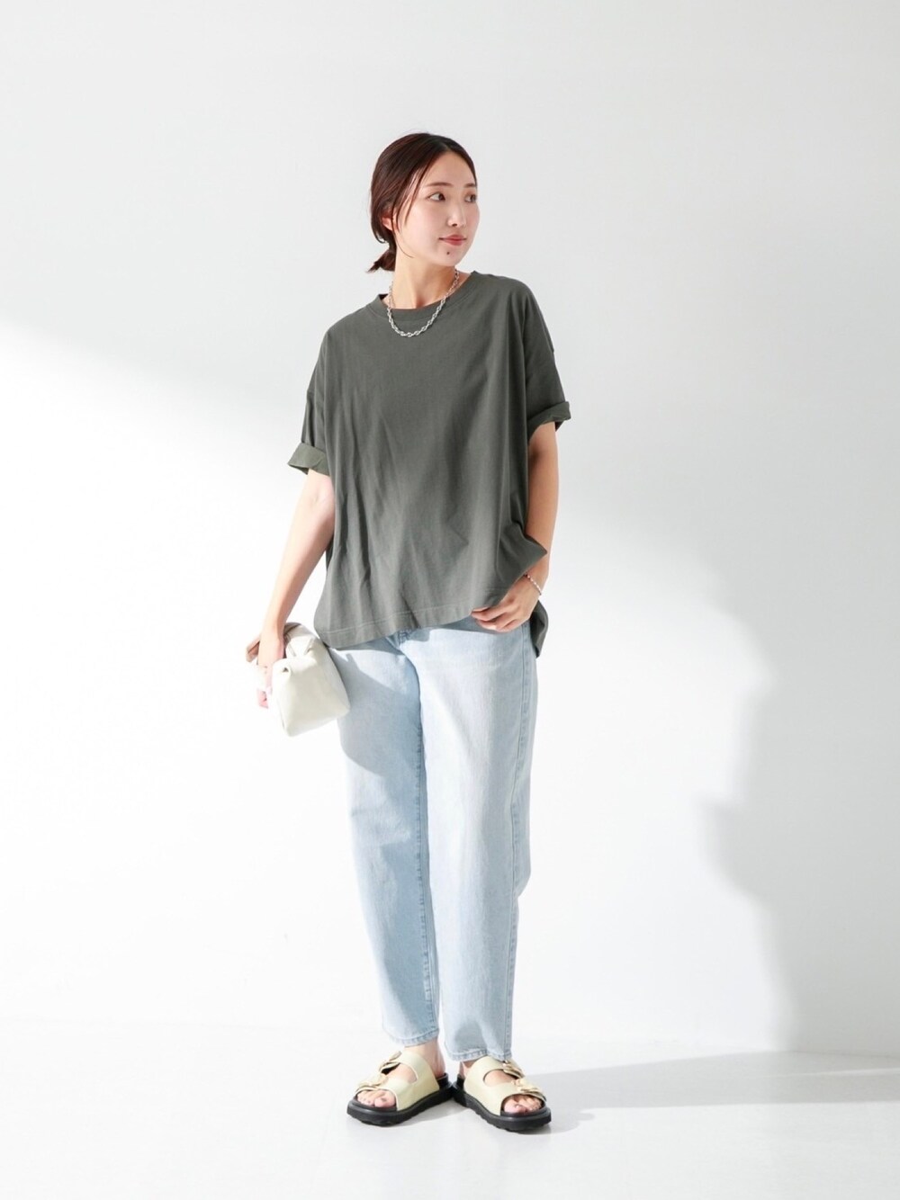 夏に嬉しい機能がたくさん付いたSHELTECHを使用したカットソー* 二の腕、腰回り、お腹周りをうまくカバーしながら 涼しくお召しいただけます◎ シンプルなのでタイトスカートや柄やカラーのパンツなど、 今年着たいボトムとも合わせやすいデザインです! 今回はデニムとシンプルに合わせました。 Tシャツ×デニムはメンズライクになりがちなので、小物はオフ系で統一しました!