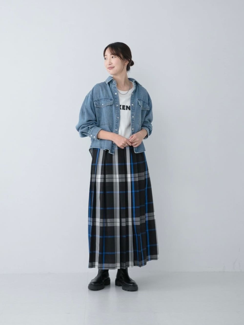 チェックプリーツイージースカートの予約がスタートしました! 今回は、オフ・ブラック・ブルーの大好きな配色のブラック系を履いてみました! ロゴTシャツとデニムシャツと合わせて、 少し秋らしさを意識♩