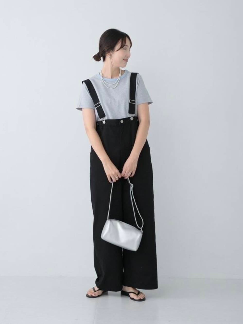 着用コーデ:33件\晩夏wish list / ルーズなシルエットが今っぽい、 ハイウエストルーズサロペット! インナー次第で長く着られそうなアイテムです。 デニムとブラックの万能な2色展開で、 サロペ好きさんは是非チェックしていただきたいアイテムです◎ インナーは追加予約受付中のJQベーシックコンパクトTシャツを合わせました! シンプルなのに無地ではなくヒトクセあって、 透け感のない素材なので汗染みなども気になりにくいのが嬉しいポイントです◎