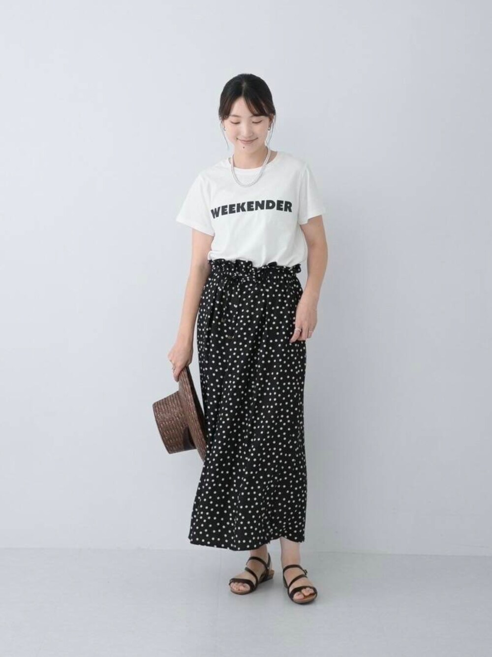 \ 晩夏wish list / スタイリングのアクセントにぴったりな、 シンプルなロゴTシャツ* ベーシックなサイズ感で1枚でもインナーにも重宝しそうです◎ 今回はドットのスカーチョと合わせたモノトーンコーデにしてみました!