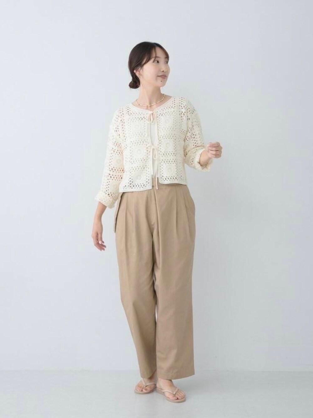 \ 晩夏wish list / モチーフ編みをはぎ合わせたデザインのカーディガン。 手編みのようなどこか懐かしい雰囲気もありつつ、リボン開きが今っぽいアイテムです! 透かし編みなのでキャミソール と合わせれば今からお召しいただけます◎ 冬になったらニットとレイヤードしても可愛いかなぁ♡なんて思ってます。 ベージュのパンツと淡いトーンでまとめたスタイリングにしました!