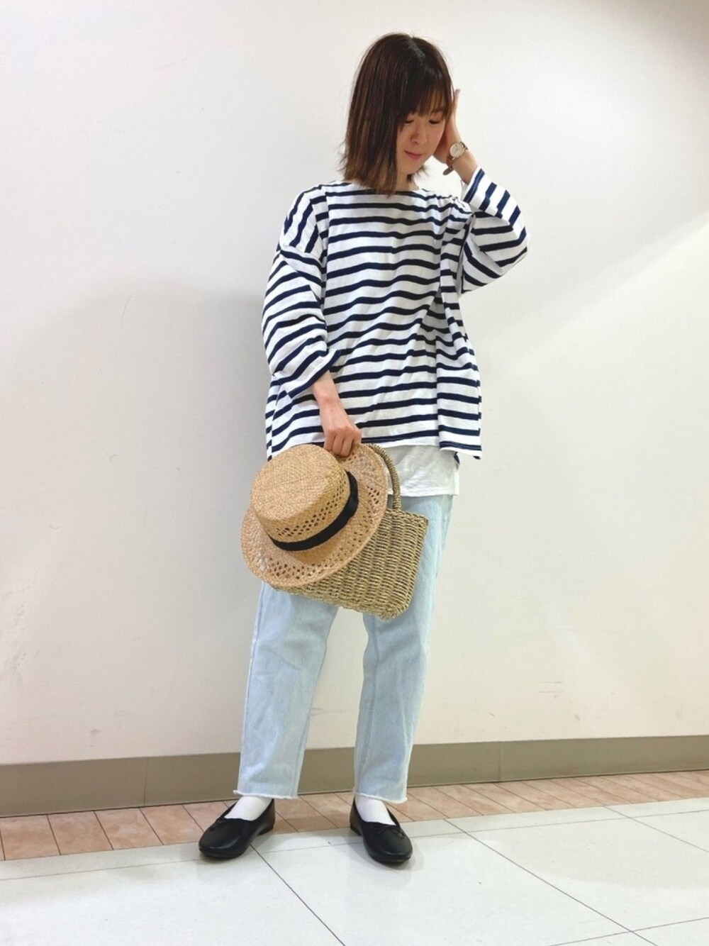 こんにちは☺︎ 先日の出勤コーデです🌼 私の大好きなボーダー×デニムで合わせました! こちらのトップスとデニムはどちらも期間限定価格となっております◎ 夏の定番アイテム、麦わら帽子やカゴバッグも入荷しています😊 ぜひお近くの店舗やオンラインショップでご覧下さい!