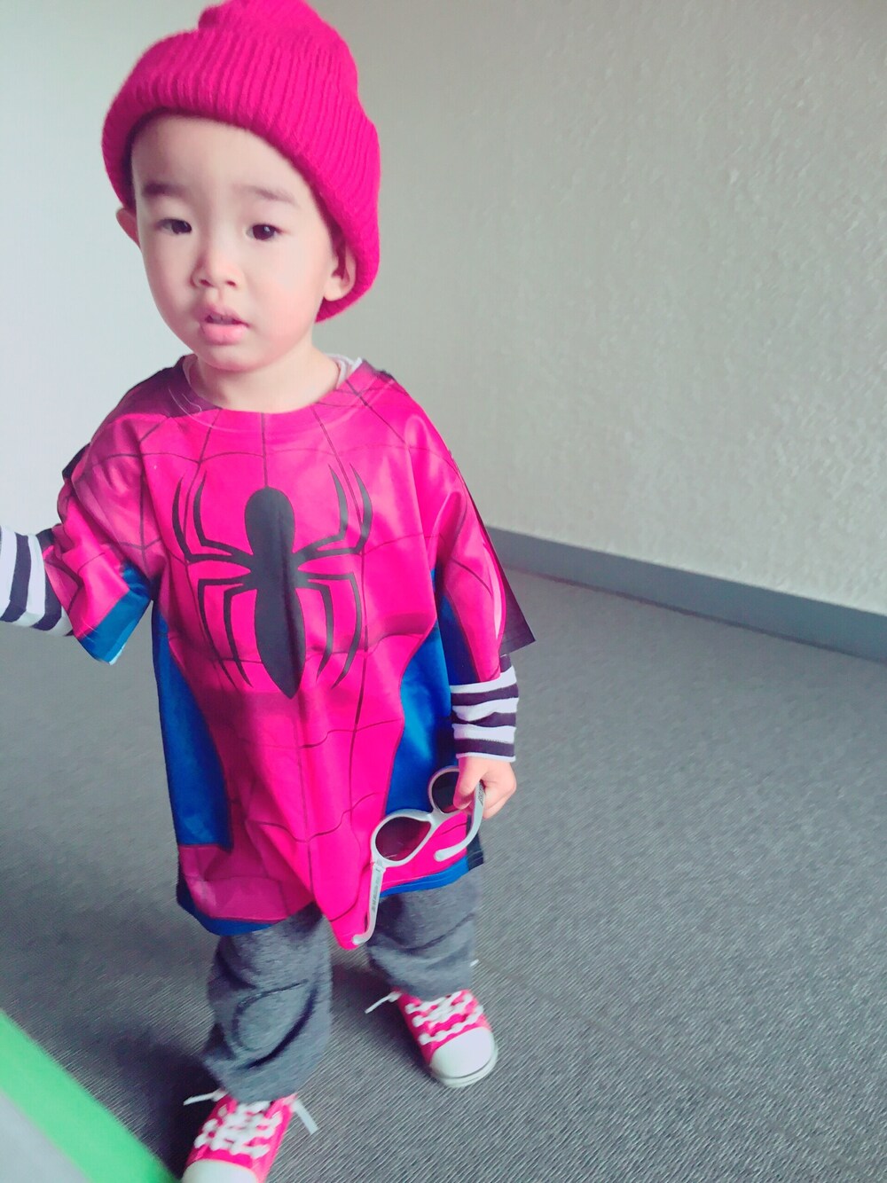 ハロウィンコーデ♡ スパイダーマンのTシャツ着ただけw 赤のニット帽とスニーカーで統一感。