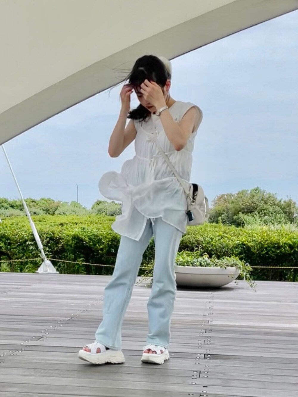 白が気分なこの夏は 白いお洋服ばかり着てる気がする〜^^ チコのサンダルは身長盛れて最高デス✌︎