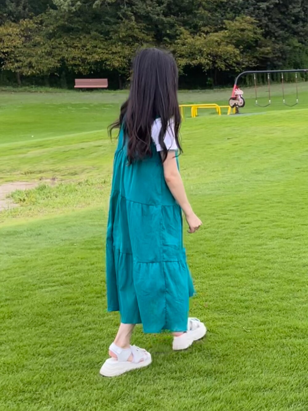公園で走り回った日のコーデ𓂃◌𓈒𓐍 ワンピースはキッズサイズだけどゆったりしたデザインなので大人の私も着れちゃいました☺️ ティアードスカート大好き🫶🏻