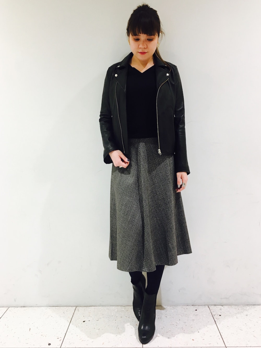 いつもいいね、お気に入り、フォローありがとうございます😊 レザーとスカートでモノトーン🌚 わたし、レザーが大好きでわりと持っているのですが レザーを着る季節が、いちばんお洋服が楽しい季節ですよね❤️ 最近はお天気もあまりよくないし、いい季節なのに!と今日お客様とお話していました。。 からっと晴れてほしいですね☀️