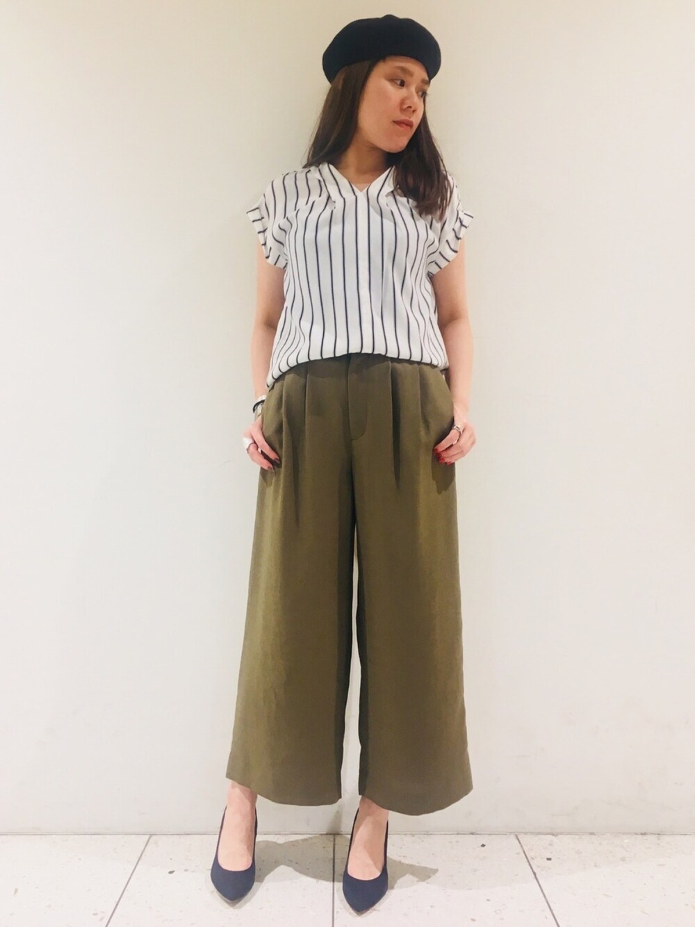 moeのシャツ/ブラウス「ストライプタックVネックブラウス」を使ったコーディネート
