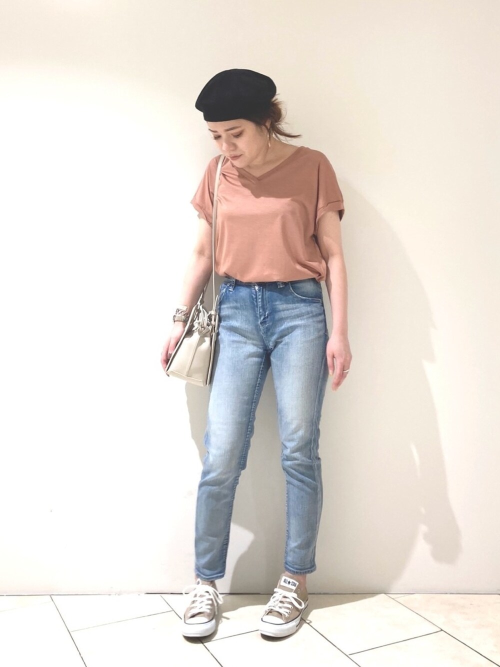 かわいい色のカットソーと 薄めデニムでデイリーカジュアルスタイル🙆‍♀️ ベージュのコンバースがポイントです😋✨