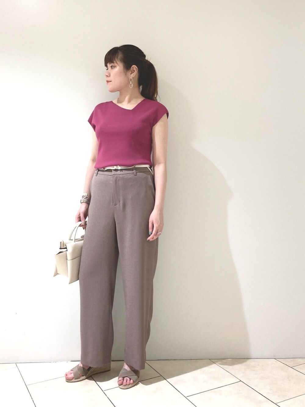 不思議なV開きのニット🙌 新鮮でカラーがかわいい🙆‍♀️ ピンク×グレー系は大好きな色合わせです! 夏でもさらっと涼しい素材感のスタイリング👗✨