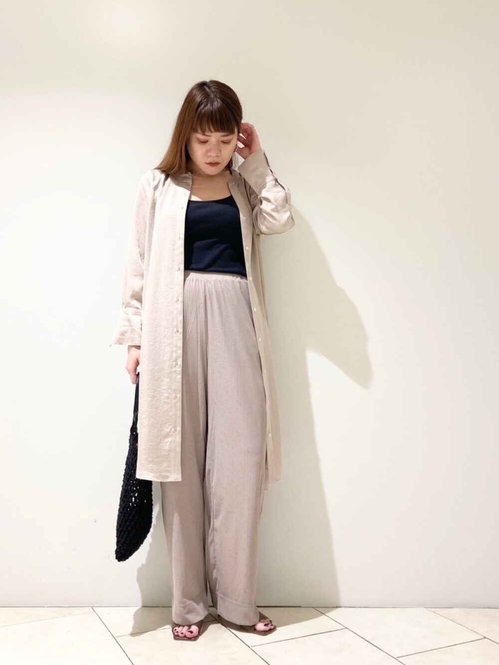 サテン地ロングシャツスタイリング🙆♀️✨ 梅雨寒にもオススメのロングシャツ😋 なんにも考えずパッと羽織れるけど 今回はベージュコーデで🙌