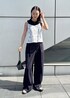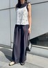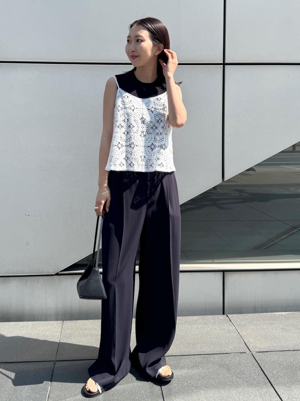 トップス‥Fサイズ着用 キャミソール‥Fサイズ着用 パンツ‥38サイズ着用 レースのキャミソールを主役にしたかったので、中物はネイビーで統一してホワイトのレースが映えるように。 パンツが落ち感のあるきれいなシルエットのため、カジュアルな印象になりすぎない大人カジュアルスタイルが叶います。 レースキャミソールの中はブラックで合わせても素敵ですが、黒の色味でコントラストが強く出がちなので ネイビーで合わせると柔らかい雰囲気になるのでおすすめです◎