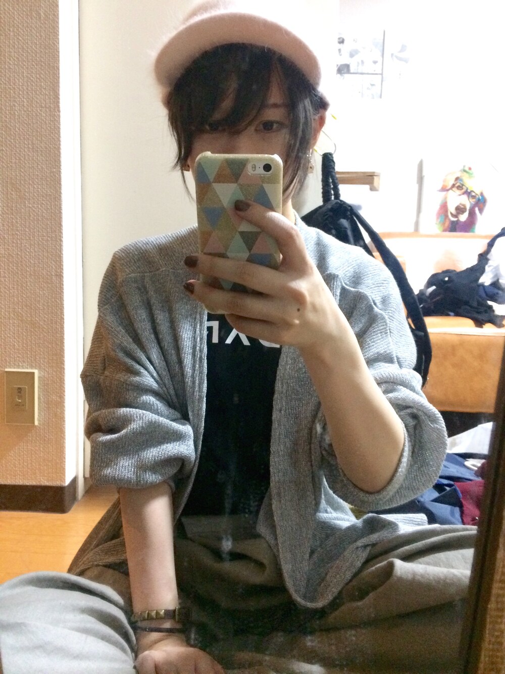 今日着たやつ 全体的に淡い色合いになった。 少し肌寒かったのでカーディガン着用 この無駄にダボついたカーディガン大好き。💘