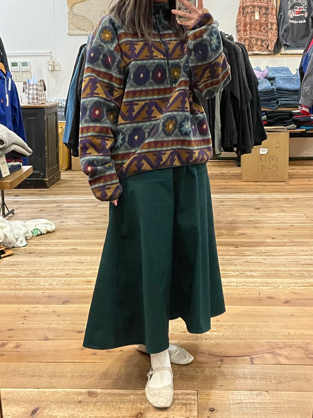 コロンビアの柄フリースに無地スカートを合わせて足元は軽めにカンフーシューズでコーディネート😶🌫️