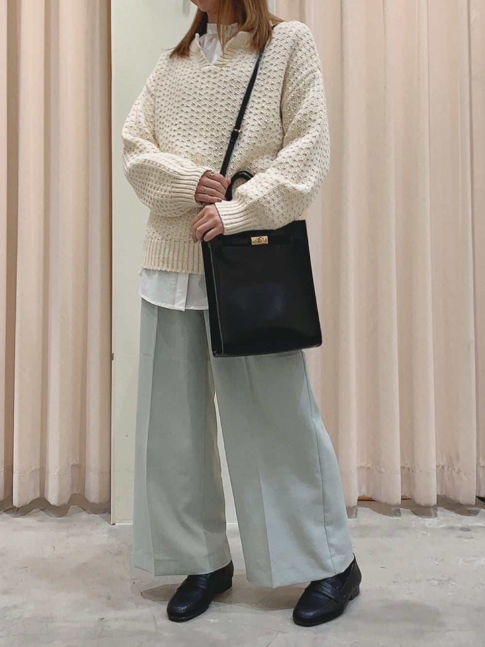 こんにちは! 肌寒い日に使えるニットに 春らしいミントのパンツを合わせてみました✨ カジュアルにもきれいめにも使えるパンツです!
