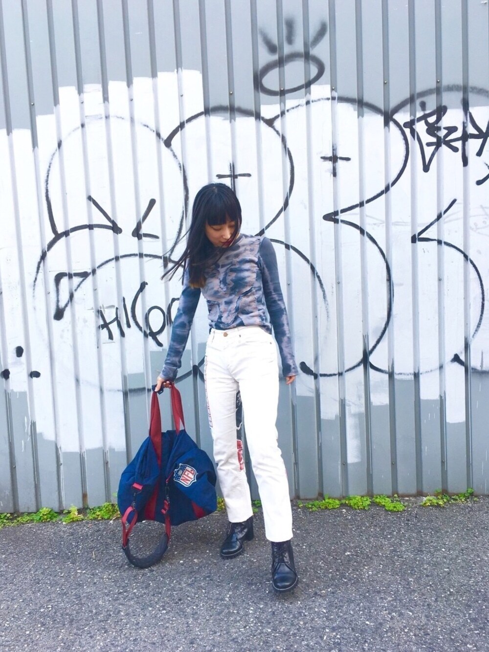 夏らしい白いズボンを主役にしたコーデです!たくさん服を買う予定だったので思い切ってアメカジ風のドラム缶バッグででかけました笑 背が低いため基本バランス良く見せるためにトップスはぴったりめの物を選びます◎