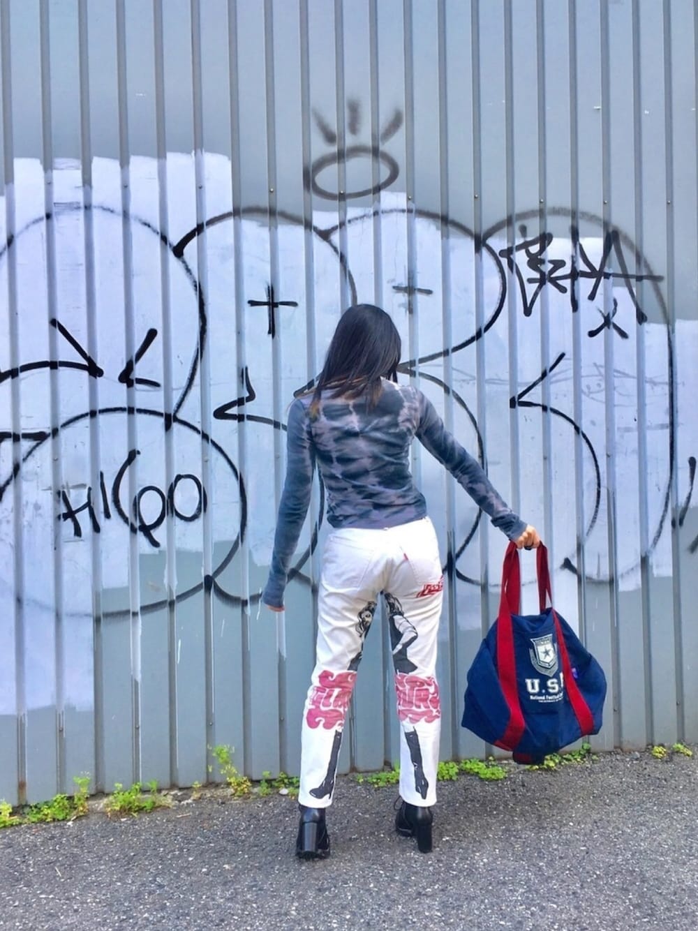 古着で買ったヒステリックグラマーの白デニムは後ろのプリントがポイントです! 足を閉じたら大きなロゴと女の子がつながるようなデザインが◎