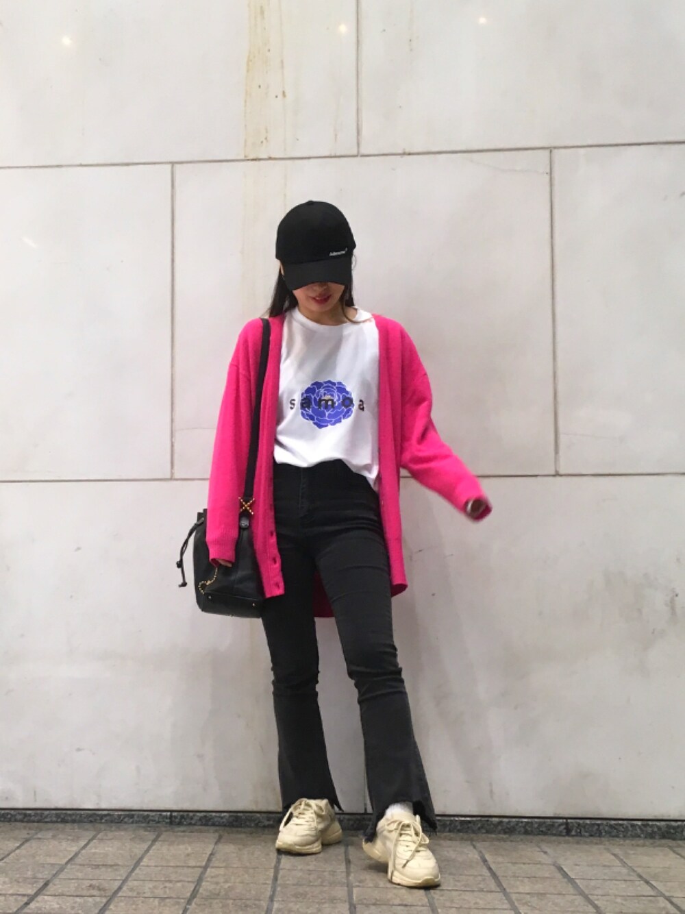 1枚で差し色にもなってモノトーンコーデの邪魔をせずモードにしてくれるピンクのカーディガンが主役です。