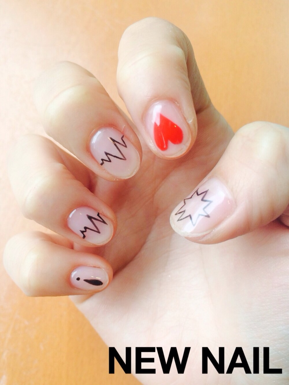 にゅーねいる。 今回はシンプルに、心電図模様! 何かを指差したりするときに目をひくので、 人差し指のデザインをちょっとだけ目立つものにしてます。 さりげなくがポイント(^o^)