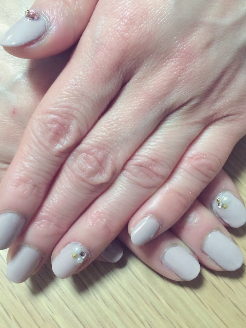 成人式のネイルストーンが余ったので、 即興でおかんのネイルした〜 大人シンプルめにグレージュ。 マツコデラックスのネイルを参考にしました😎