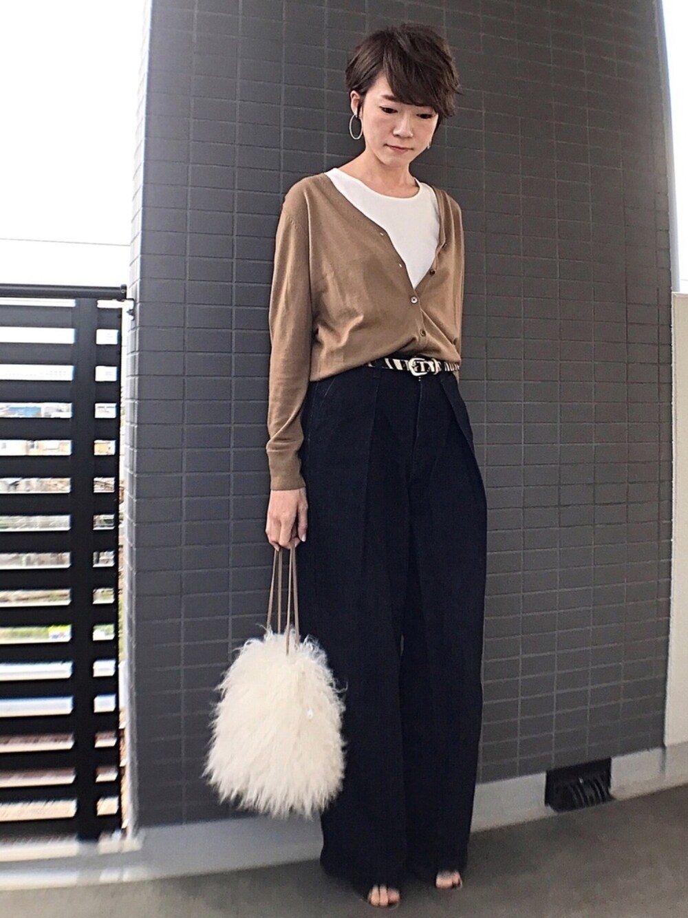 カーデ×ワイドデニム プチプラコーデです。 ファーのもふもふバッグがポイント!