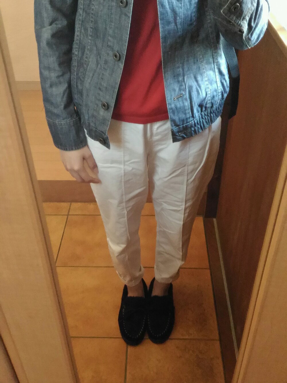 秋なのにマリンコーデ(笑) 赤ニットトップス★A.P.C デニムジャケット★HYSTERIC GLAMOUR ホワイトパンツ★カスタネ