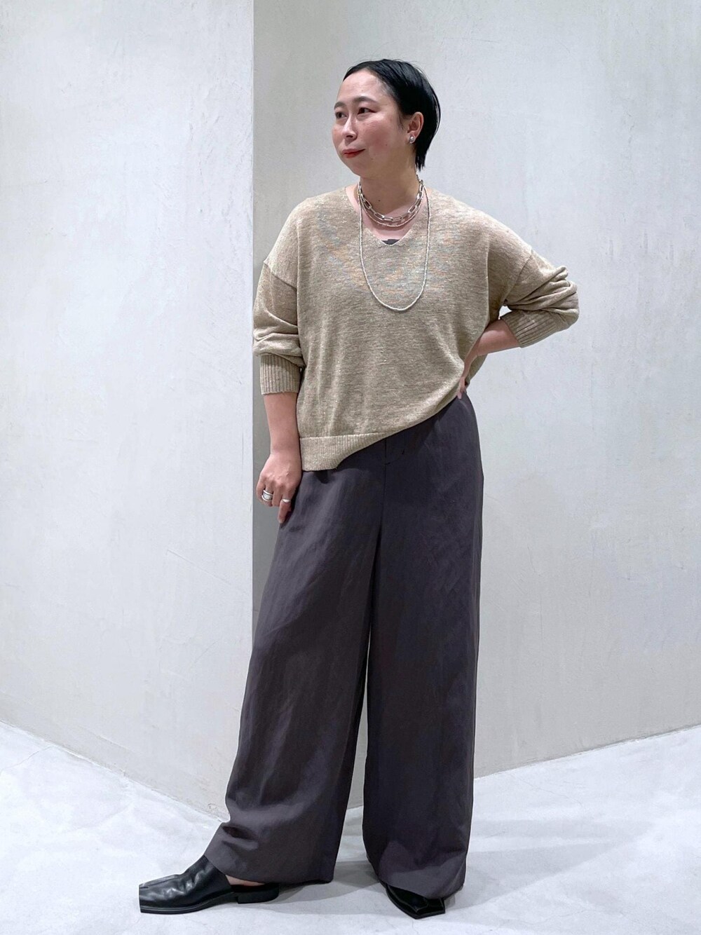 店頭でも大人気のスパークルリネンラメVネックプルオーバーのご紹介です。 ラメ糸が織り込まれて、さりげなく華やかさを演出してくれるこちらのニット。 Vネックのすっきりとした開きと、適度なゆるさと落ち感がとっても可愛いので、今回はオールインワンの上にアウトで着て見ました。 真夏手前までさらりと楽しめるニットです。 ※記載のないアクセサリーは私物となります。 ※記載のないアクセサリーは私物となります。