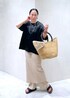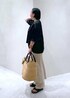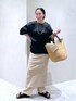 店頭でも大人気のこちらのトップス。 アセテートの上品な艶感が今年らしく、程よい抜け感のあるオーバーなサイズ感◎ 少しモードな雰囲気にしたかったので、ボトムスはPheetaのコンパクトなパンツとスカートをレイヤードして、サンダルは黒で合わせました。
