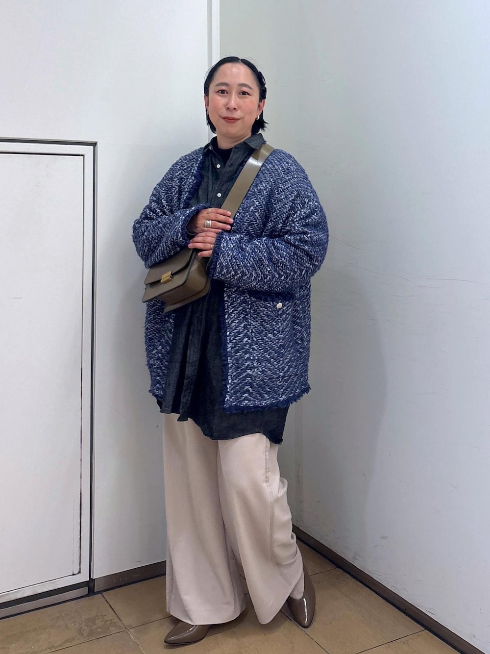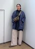 いつもご覧いただきありがとうございます。 ラメツイードがポイントのフリンジツイードブルゾンをデニムシャツと合わせてブルーのグラデーションで合わせてみました。 たっぷりしたゆるめのシルエットがラフに着られて、ちょっとしたお出かけにも重宝する1枚です。