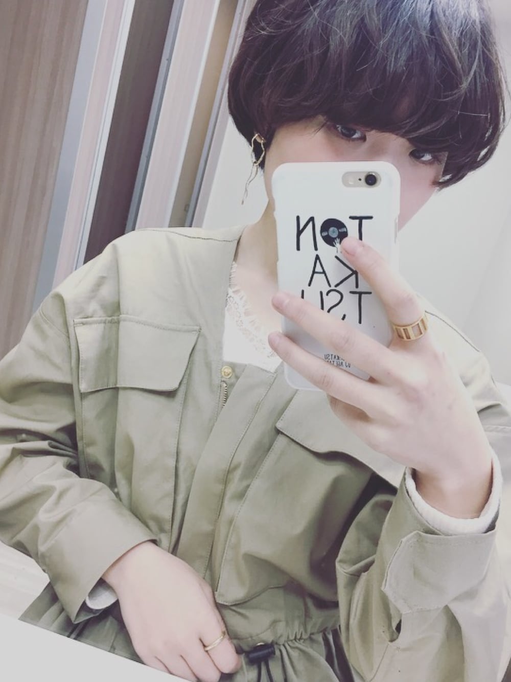 ミリタリージャケットはウエストが絞られていてシルエットが綺麗にまとまる。襟元はレースのインナーをレイヤードでカジュアルになりすぎないようにしました