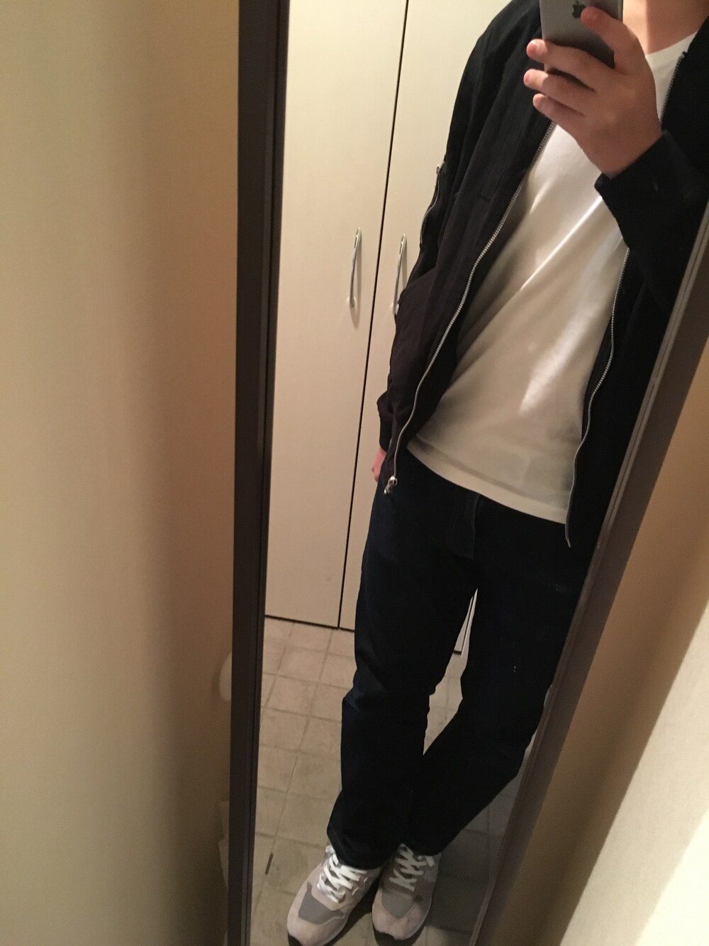 念願のニューバランスを 初任給で購入( ^ω^ ) 頑張った自分へのご褒美です(笑) 今日は風が強くて肌寒い感じなので MAー1にしてみました♪