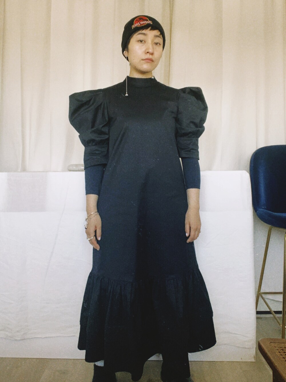 パフスリーブのワンピース。