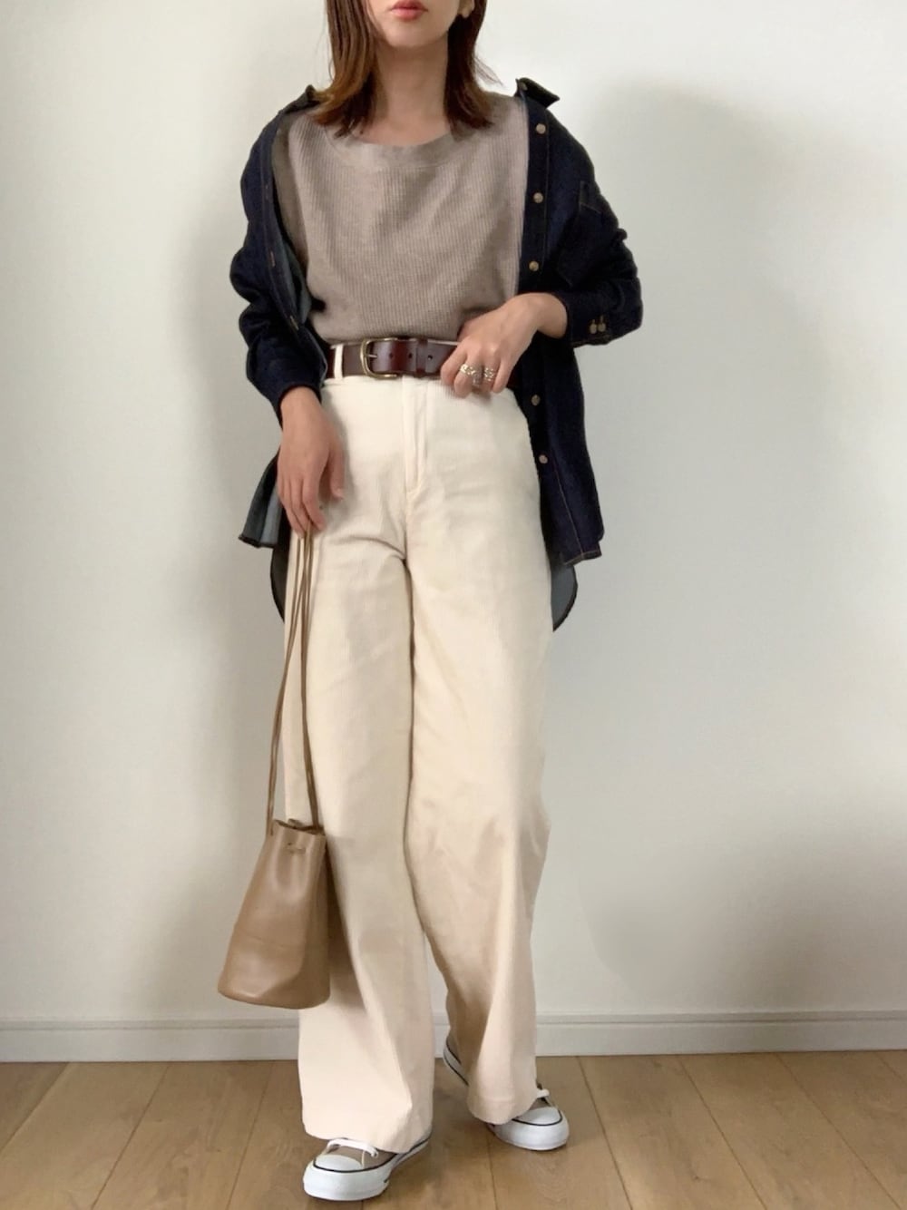 濃い色のデニムシャツにカフェオレコーデ☕️ 見て頂きありがとうございます☺︎