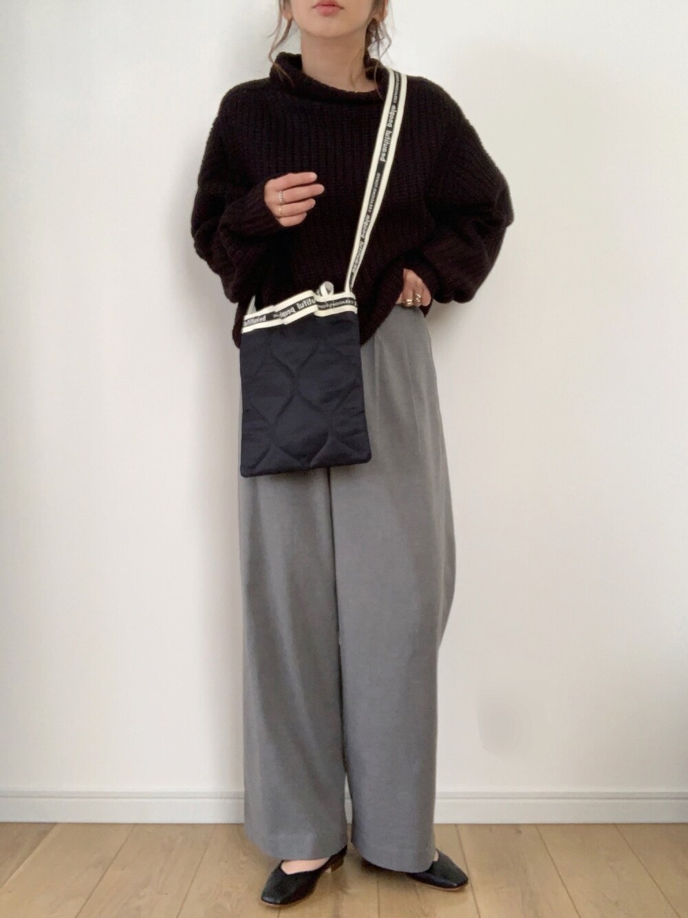 ボリュームたっぷりな袖にプチハイネックの抜け感のバランスが可愛いニット♡ 本日クーポン出ています☺︎ マルチサイズのワイドパンツはグレーの色味が絶妙でお気に入りです。 見て頂きありがとうございます。