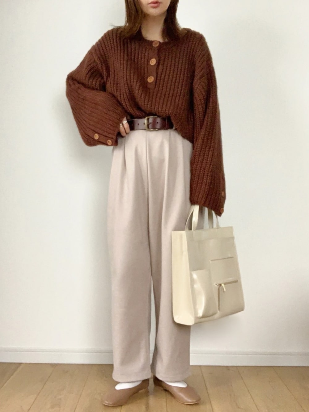 maiko のニット/セーター「【ファッションインフルエンサーしゅんたろー×BARK MANHATTAN 限定コラボ】3G畔編みヘンリーネックウッド釦デザインニット」を使ったコーディネート