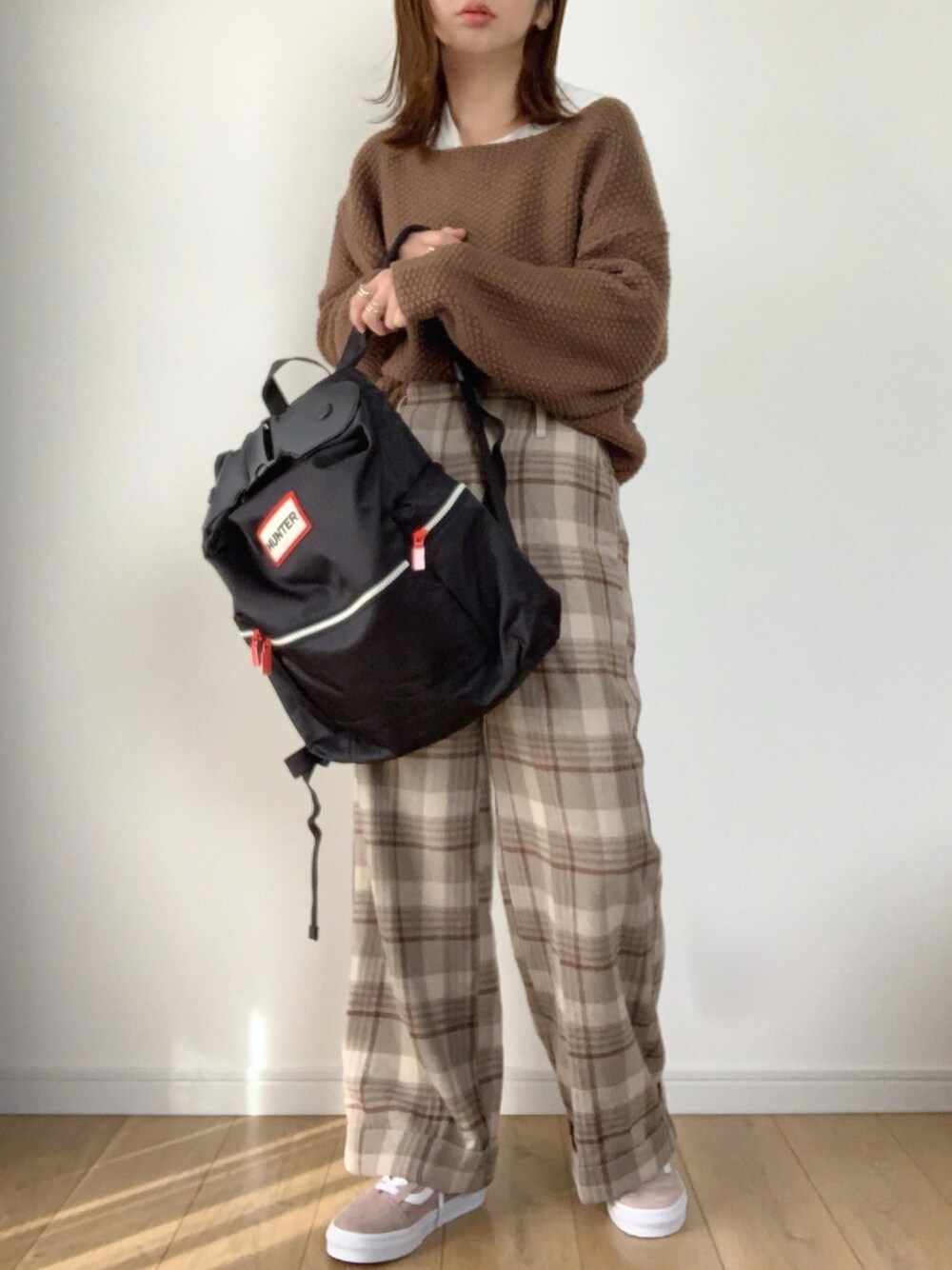 アプレジュールミニョンのニットは、たっぽりしたシルエットに襟がぐっと開いた抜け感のバランスがたまらないです☺︎ カジュアルな感じのコーディネートにしたかったので白Tを合わせました。 HUNTERのバックパックは見た目はもちろん可愛いですが、機能性の高さがすごいです◎ 通勤通学、ママバッグとしても活躍すると思います。 見て下さりありがとうございます。