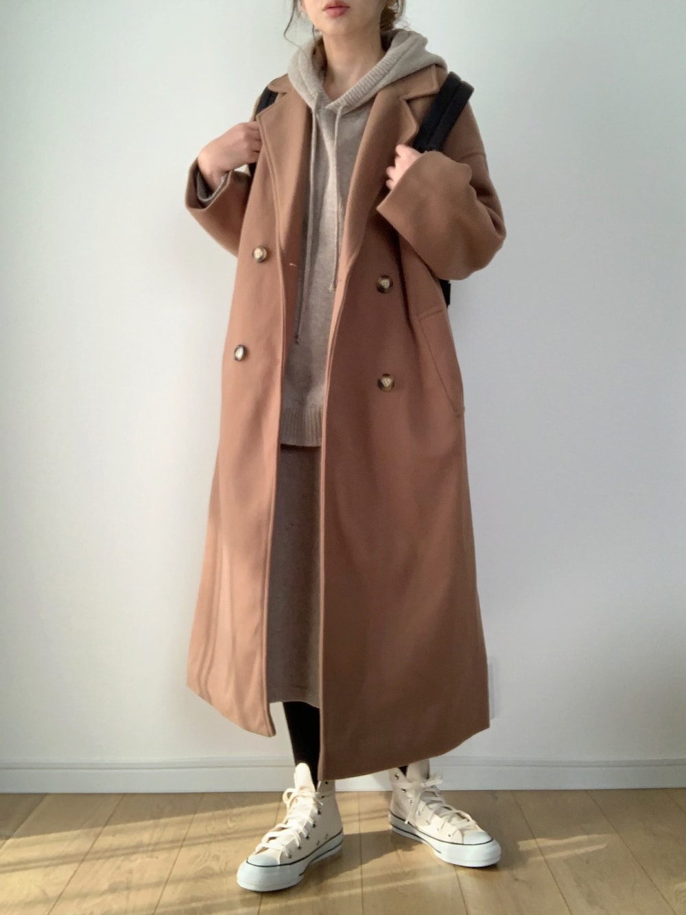 ニットパーカーのセットアップにチェスターコートであったかラクチンコーデです。 アイボリーのコンバースで足元は軽くしました。 見て下さりありがとうございます☺︎