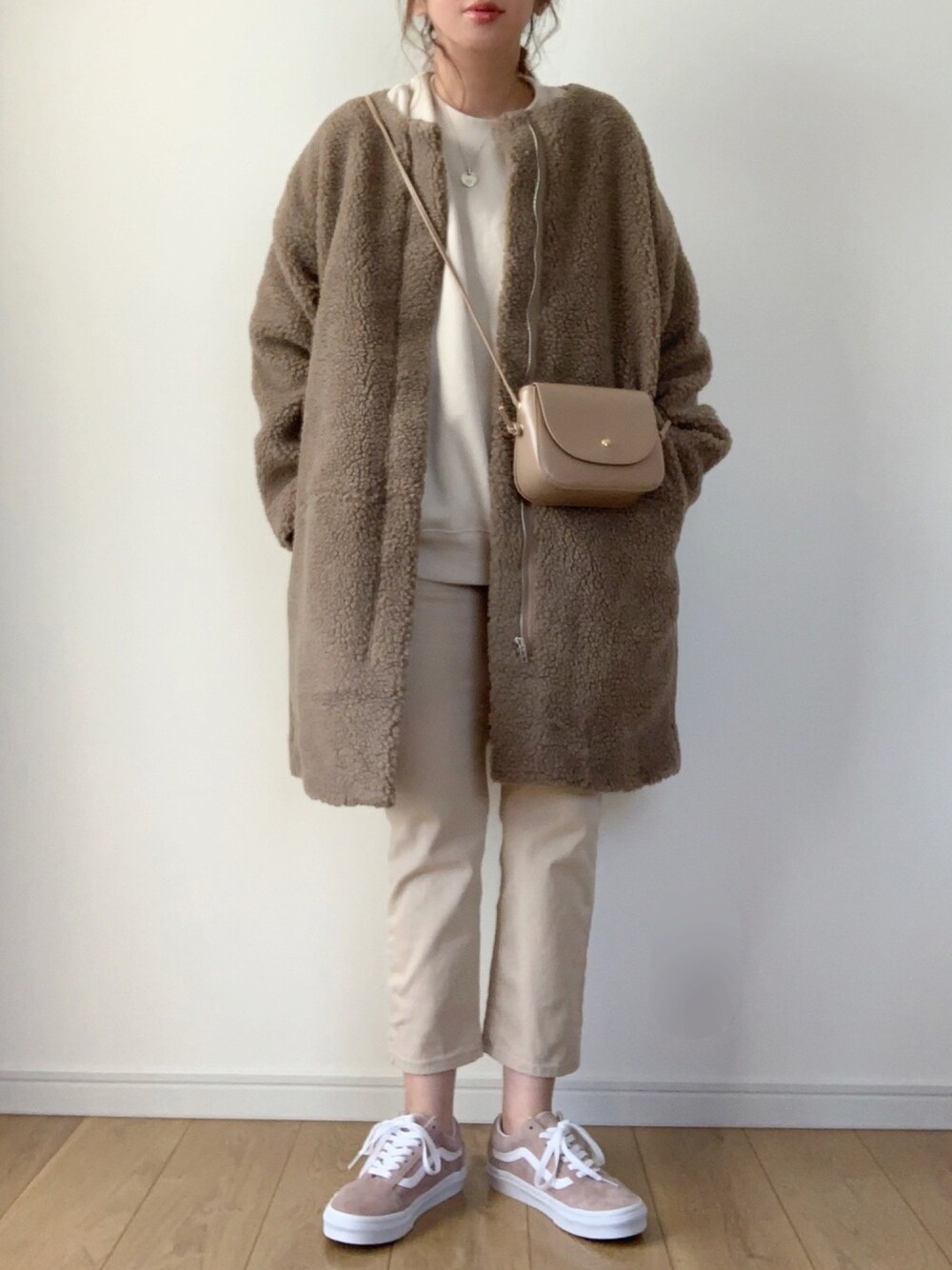 モカのボアコートはベージュコーデで明るく合わせました☺︎ まだまだ寒い日が多いので活躍してます! 丈が短めなパンツの時はold skoolの厚みがしっくりきます。 ボアコートはzozotownで今日クーポン出ています☺︎ 見て下さりありがとうございます。