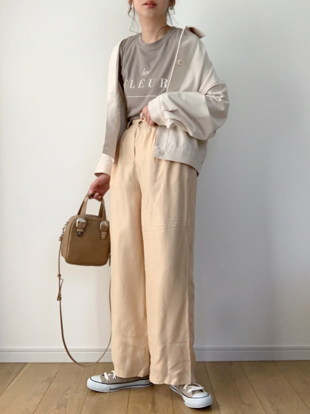 ラクチンなパンツにロゴTでカジュアルな感じです☺︎ 春素材でサラッとした肌ざわりがストレスフリーな履き心地です。 UNIQLOのジャージーリラックスジャケットも着やすくて◎ パンツは本日クーポン出ています。 見て下さりありがとうございます。