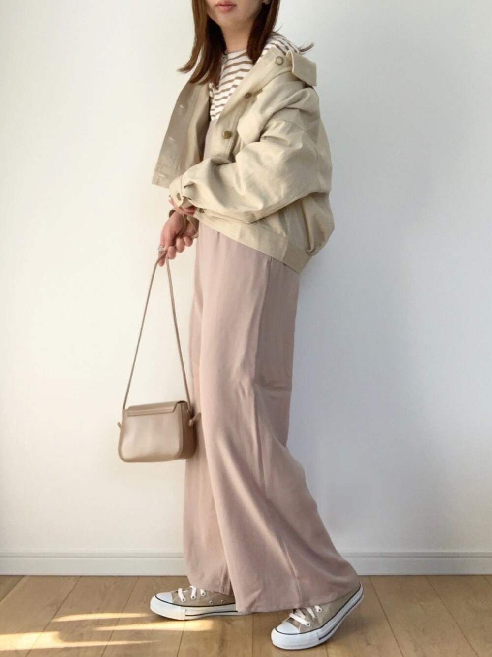GUのサロペットにアプレジュールミニョンのショートブルゾンを羽織りました☺︎ このブルゾンのふんわりしたシルエットが可愛いすぎます。 ショート丈なのでダボっとしすぎず良いです♡ バッグが裏返しになってしまった(´-`) 見て下さりありがとうございます。
